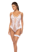 A floral lace and transparent mesh bodysuit that offers added support with underwire. It features a lace-up back design, adjustable straps, and adjustable crotch and garter fastening for a versatile and stylish look. Includes leg garter.