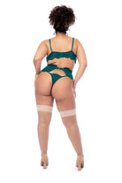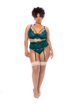 Rich hues of precious stones captured on your skin. Three-piece eyelash lace set featuring top with underwire and adjustable straps, garter belt, and matching thong. 8866X
