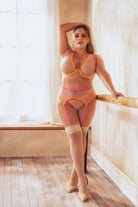 A comfortable and flattering set which blends into your skin, giving you the sensuality of transparency and framing your figure in a contrast effect full of vibrant and energetic colors. Underwire top with adjustable straps, garter belt and matching thong. Item No. 8713X