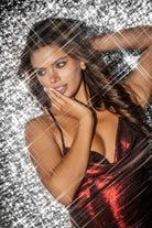 Designed to sparkle under the lights, this sultry dress stuns in shimmery red fabric with a sensual open back and adjustable straps for the perfect fit. Includes a matching panty with chain details to show off.