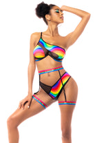 Colorful and sensual set with an underwire top, matching panty and a elastic garter belt with rainbow print. Item No. 2720