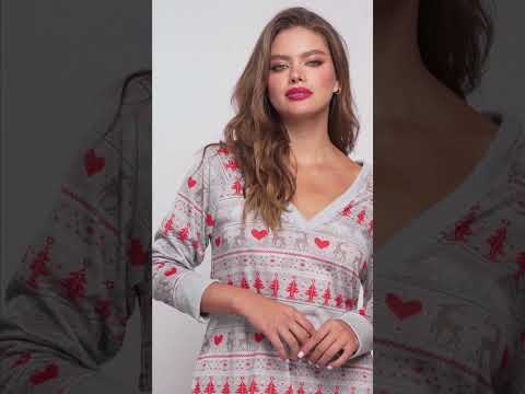 Long sleeved sleep chemise in a fun Christmas print. Loose silhouette. 7597. Hand Wash. Do not Bleach. Do not Iron. Flat Pack