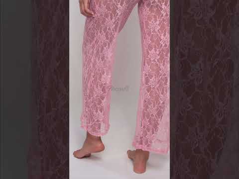 A sophisticated two-piece set in a floral lace. Includes top with adjustable straps and long pants. 7600. Hand Wash. Do not Bleach. Do not Iron. Flat Pack