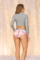 Two-piece set in Christmas print and gray ribbed contrasts: Long-sleeved crop top with decorative buttons and Matching cheeky short. Item No. 7532