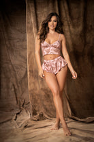Two-piece set in an original wild print: Top with adjustable straps and Matching flared shorts. Item No. 7520