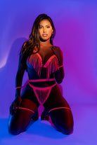 Turn up the heat with this playful two-piece set in a vibrant wet-look pink. It features top with an open-cup design with fringe details, a matching fringe bottom with attachable garter straps and wrist cuffs.
