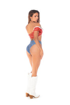 Giddy up in this seductive two-piece cowgirl costume, featuring a western plaid off-the-shoulder tie-front top with lace ruffle trims and high-waisted denim print bottoms for a flirty, wild look.