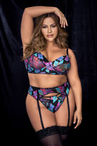 A nocturnal flower pattern that evokes sensuality and mystery. Three-piece set. Includes top with removable straps, garter belt and matching thong. Item No: 8770X