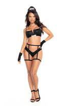 Sexy police costume. Includes top with V-separator neckline and adjustable straps, matching thong in a wet look fabric, elastic garter, gloves and head piece. 60036