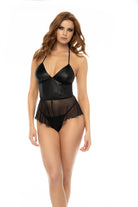 An elegant yet simple upgrade of a timeless design. This romper is crafted from wet-look fabric and transparent mesh, featuring a halter neck-tie and a matching thong.