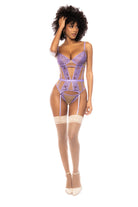 Indulge in confidence and seduction with this two-piece set. Features bustier with lace and transparent mesh contrasts, underwire, adjustable straps, built-in garters and a matching thong.