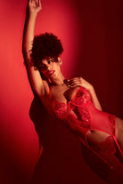 This two-piece set screams passion. Featured in a sequin embroidered mesh, Includes a bustier with underwire, lace-up back design, adjustable shoulder straps and matching thong. 8896