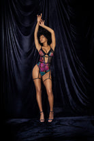 Experience comfort and confidence with this floral print bodysuit which has adjustable straps, underwire and removable garter belts. Adjustable crotch fastening. Medium coverage. Item No: 8774