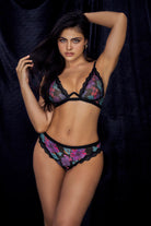An essential two-piece set with a vibrant flower print on a sheer mesh with contrasting lace trims. Top with underwire support, adjustable straps and matching panty. Medium coverage. Item No: 8771