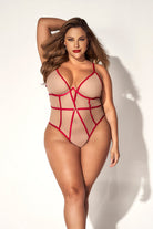 A sophisticated and refined bodysuit. Nude mesh with contrasting red accents, underwire for greater support and heart-shaped hardware detail. Adjustable straps, Brazilian coverage, adjustable crotch fastening. Item No: 8817X