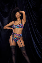 A nocturnal flower pattern that evokes sensuality and mystery. Three-piece set. Includes top with removable straps, garter belt and matching thong. Item No: 8770