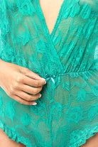 A dreamy lace romper in a semi-loose silhouette, featuring a plunging neckline and flirty ruffle trims. Soft, feminine, and effortlessly romantic.