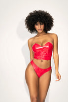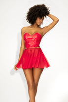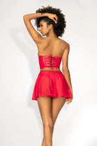 Vinyl with a romantic twist. A versatile two piece set that turns into a babydoll. Sweetheart neckline vinyl bustier with a lace-up back, matching thong and a removable sheer skirt. Item No: 2741