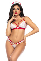 Sexy nurse costume. Includes lace top, garter belt, thong and head piece. Item No: 60002
